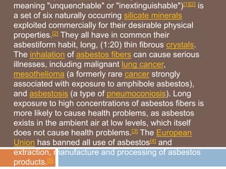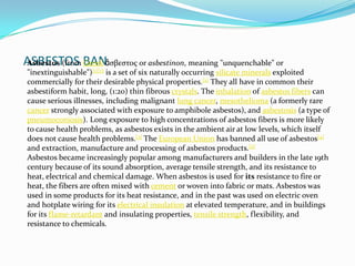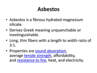 - It was named "asbestos" due to its remarkable resistance to fire and heat, giving the impression that it could not be quenched or destroyed by flames.