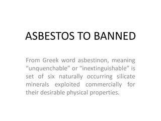 - The primary Greek meaning of "asbestos" is "unquenchable," "inextinguishable," or "indestructible."
